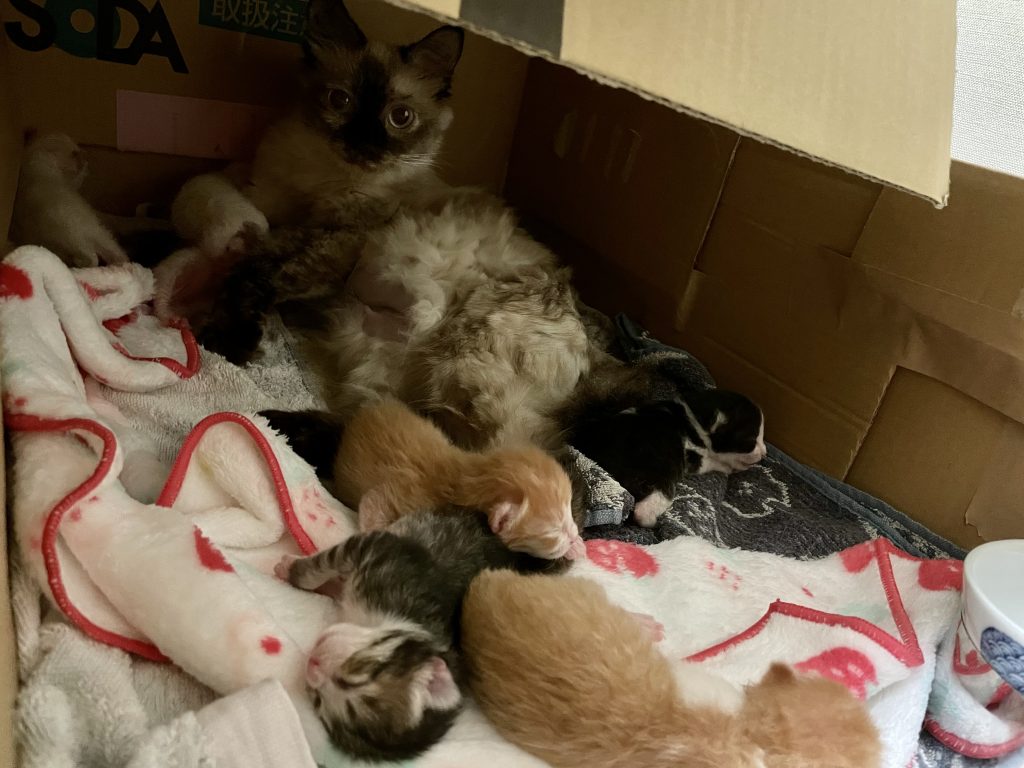 子猫たちのお世話で育児箱に入ると呼吸は荒くなります。